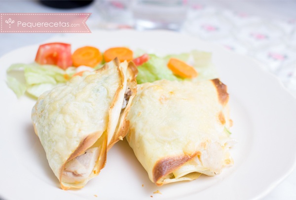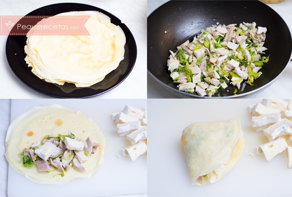Colocamos una buena cantidad de la mezcla de pollo y puerro sobre mitad de un crepe, ponemos por encima dos o trocitos de queso, doblamos el crepe cubriendo el relleno y luego a la mitad, presionando un poco con la mano para que se quede bien unido.